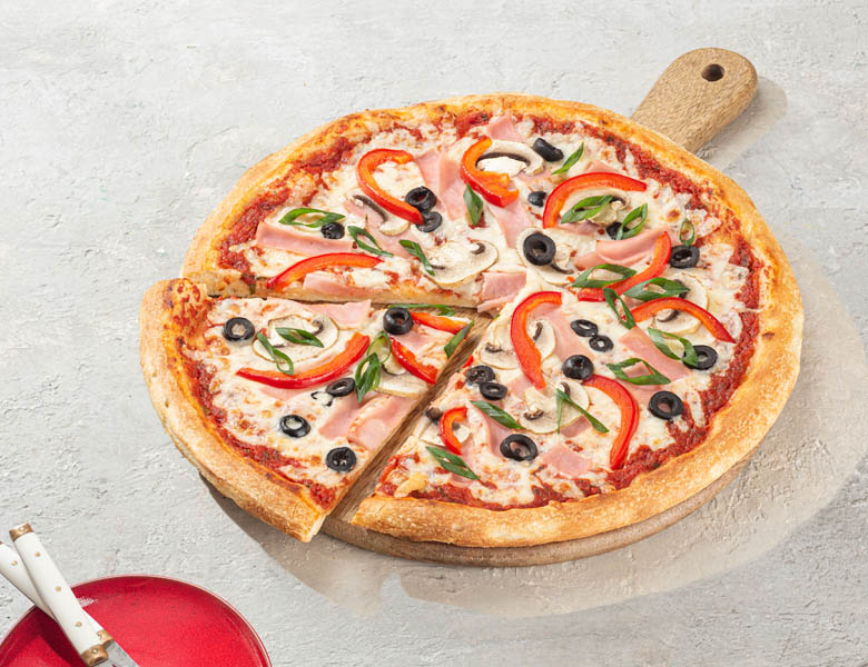 Нежная ветчина, болгарский перец, свежие шампиньоны, сыр моцарелла, и все это украшено маслинами и зеленым лучком (30 см).