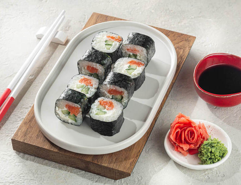 Куриное филе копченое, кунжут, икра масаго, сливочный сыр, омлет тамаго, огурец.