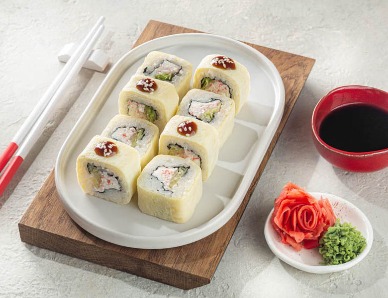 Ролл, обернутый в яичный блинчик, унаги соус, краб-крем, салат айсберг, сливочный сыр, спайси соус, кунжут.
