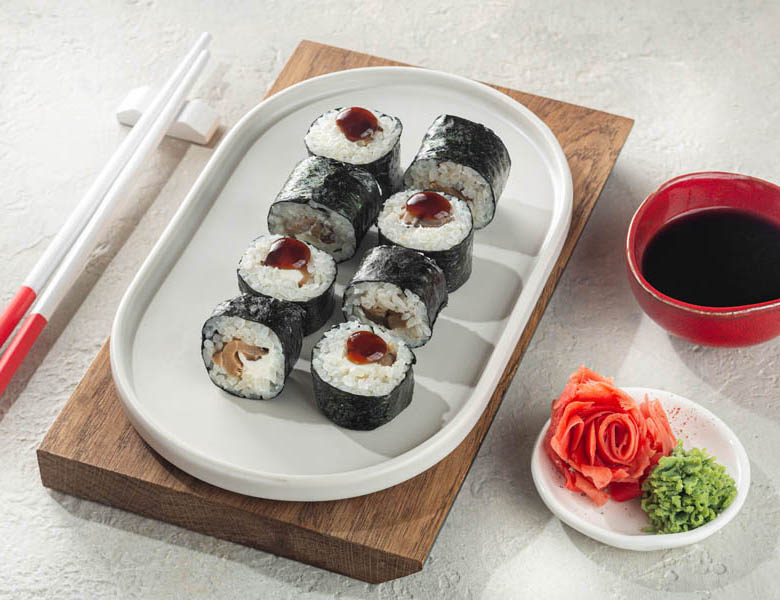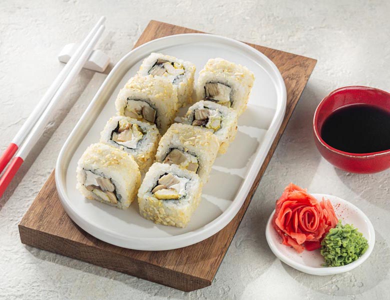 Курица терияки, соус спайси, зеленый лук, болгарский перец, сливочный сыр, огурцы свежие, кунжут, соус унаги. Запеченный ролл.