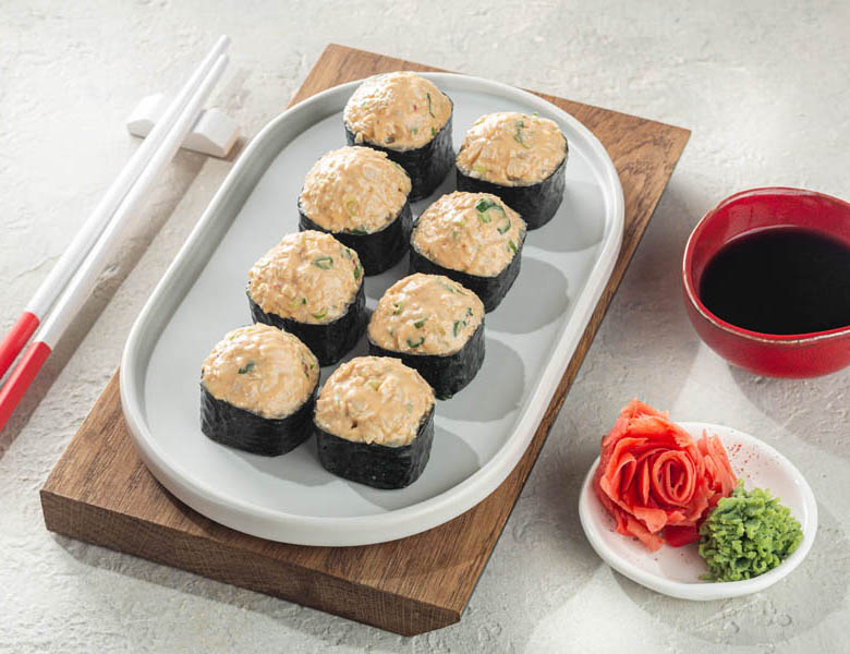 Курица терияки, сливочный сыр, соус спайси, болгарский перец, пекинская капуста, зеленый лук (холодный ролл)