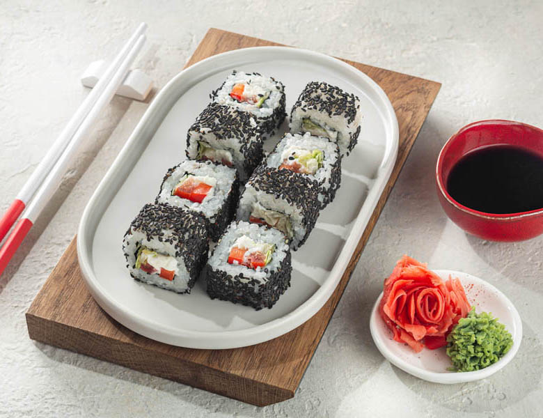Томат, сливочный сыр, пекинская капуста, болгарский перец, лук зеленый, кунжут.
